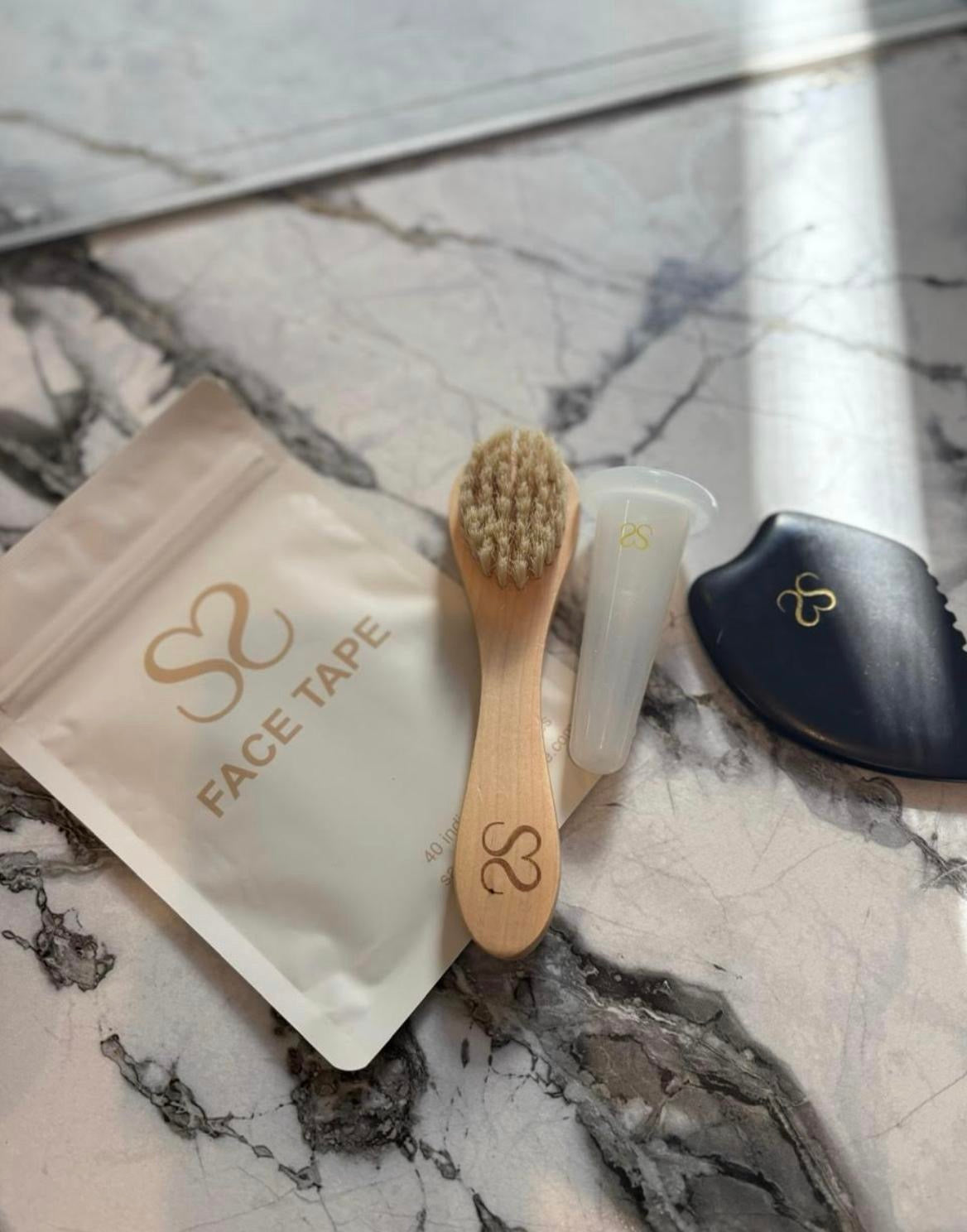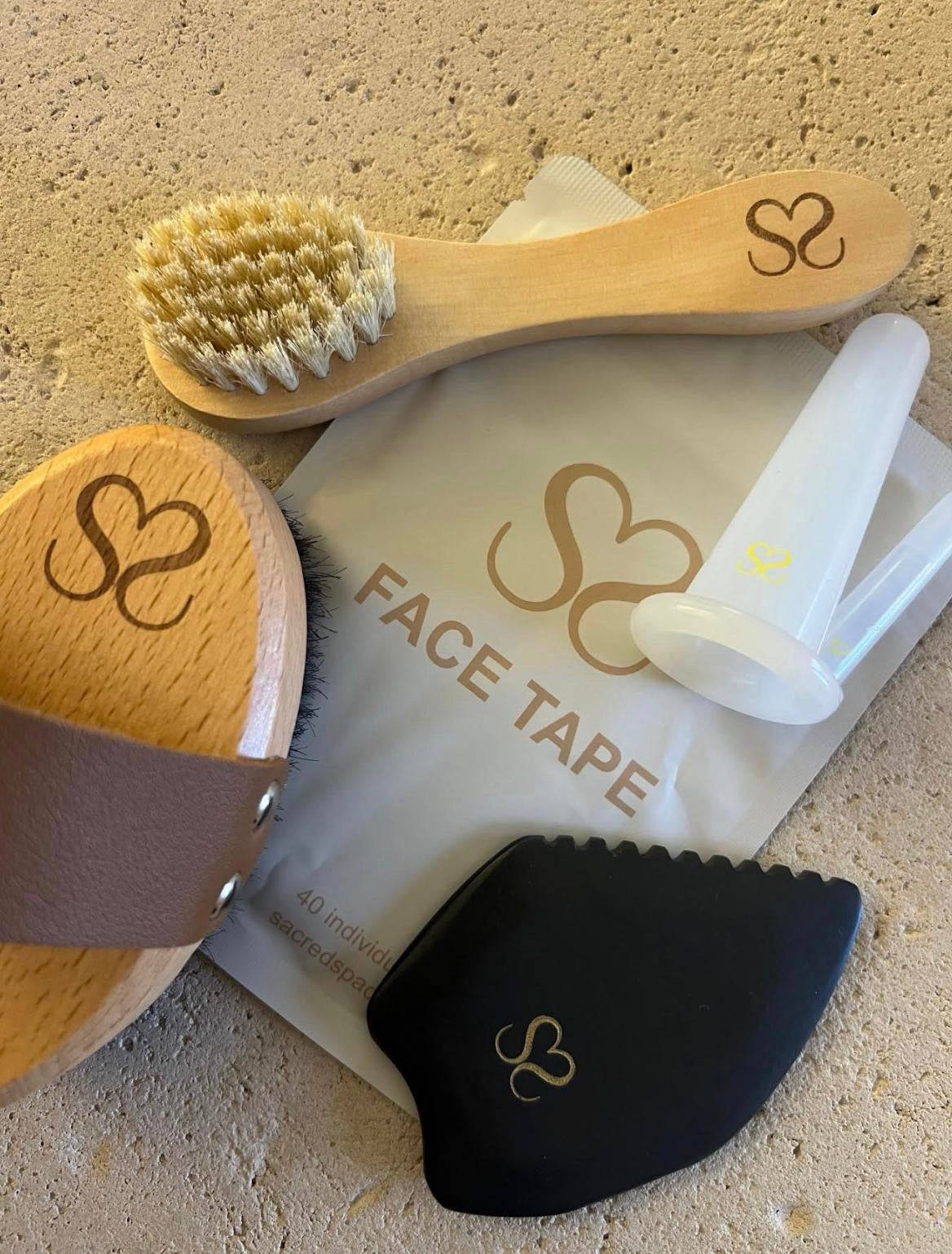 5 Tools are included: Gua-Sha Stone, Face Tape, Copper Dry Brush, Face Dry Brush, Facial Cupping Set in this Self-Care Collection.